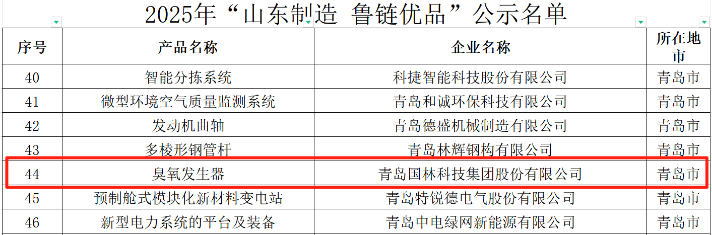 Recently, the first batch of 2025 "Shandong Manufacturing · Lu Chain Premium Products" was officially announced. The ozone generator system, independently developed and manufactured by Guolin Technology, was honored with selection due to its exceptional technological strength and product quality! This recognition is not only a strong endorsement of the company's product quality but also a testament to Guolin Technology's comprehensive strength as an industry leader.