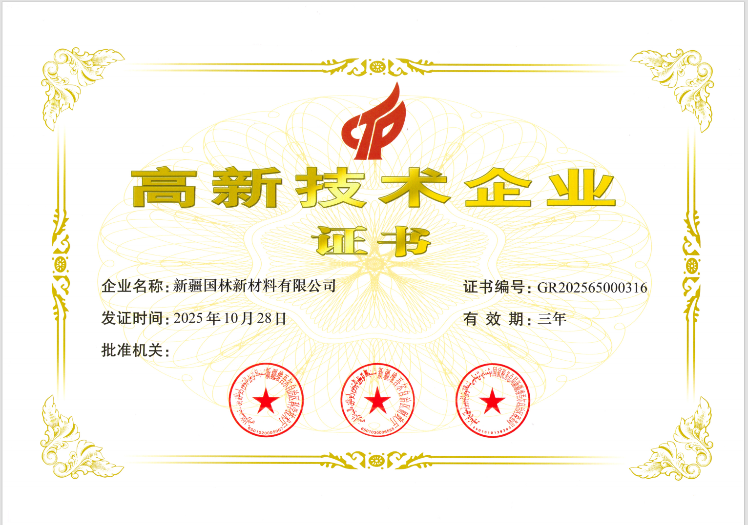 Xinjiang Guolin New Materials Co., Ltd. (hereinafter referred to as "Xinjiang Guolin") has successfully passed the accreditation for National High-tech Enterprise recognition, owing to its outstanding performance in core technology research and development, transformation of scientific and technological achievements, and innovation management systems. The company was officially awarded the High-tech Enterprise Certificate on October 28, 2025. This signifies that the company's scientific and technological innovation capabilities have received national authoritative recognition, marking its entry into a new stage of high-quality development.